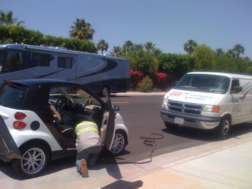Everything unhooked and I got in to drive, but no juice. The Mouse wouldn't start, no matter what we tried. Must be a dead battery. Maybe we killed it trying to put in that darned brake buddy. Triple A came to the rescue in just 15 minutes. The Mouse battery is under the floor on the passenger side of the car. The poor fellow sweated up a storm getting to it, only to find out it was fine.