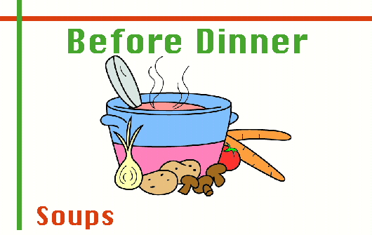Chicken Soup: This soup is really a complete meal. Leftovers are wonderful. It will warm your soul. Cream of Onion Soup: Good and hearty. It would make a whole lunch, with a small salad and a roll. Its also a terrific starter for a meal. French Onion Soup: This isnt an easy recipe, but its worth the effort. Portabella Mushroom Soup: This is an incredible soup. People will BEG for the recipe, so be ready. Good for a lunch or for pre-dinner. |