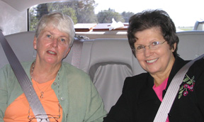 In the car, sharing cookies and sodas: Nancy, Sue, Ruth, BeeCee, Shan, and Cherie.