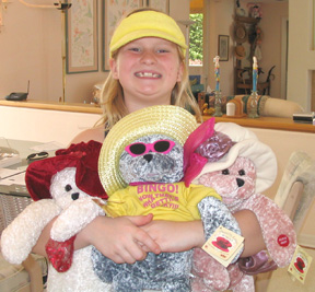 Erica holds the three talking bears that Barb bought for the girls.