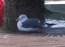I have no idea what some of these birds are. The one to the lower right is (probably) a very big seagull. And the one on the left was sleeping, with one eye on the camera person. Ken put a little meal out for the tiny wren, on the seat at our table.