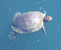 We bought some duck food and found a ready and willing audience. The one to the left would paddle hard to get sort of upright, then catch anything I could throw to it. Better by far than my dog, in terms of accuracy.