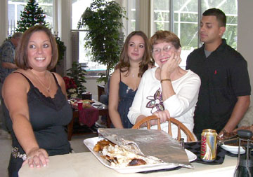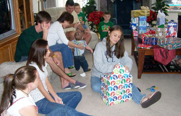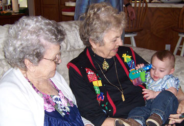 Ken and Lisa invited lots of relatives to their house for the day. Everyone brought a gift. Numbers were drawn and people chose in succession, trading a gift if they wanted. Lots of fun and laughter. Ken deep friend two turkeys, which was a new things for most everyone. The hit of the day was the young 7-month old Jordan, son of Matt and Jessica Olivera, and great-great-grandson of Edythe.