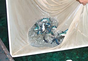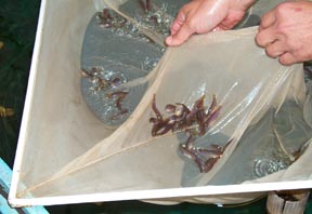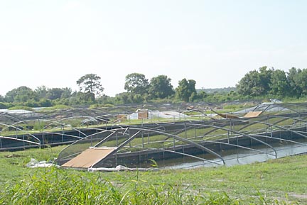 You can see the smaller tanks where eggs hatch to Tom's left. The bigger tanks on the left side of the picture are made of concrete (Tom says they are burial vaults without the top -- really!). |