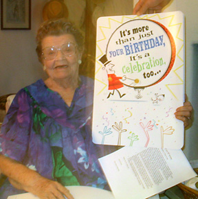 | The big card that Edythe is holding up had several messages in it: From Ruth Johnston: "Aunt Edythe: Congratulations on 95 wonderful years. You're a special lady that I'm proud to say is my aunt." From the Johnston's in Jackson Michigan: "Happy 95th Aunt Edythe." From Sharon and Glen Walls: "Dear Aunt Edythe. Unvelievable 95. Love you." The page below the big card reads: |