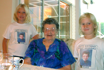| Kaitland and Erika wore their shirts from Edythe's 90th birthday party. Ashley watches as Edythe gets ready to blow out the candles. |