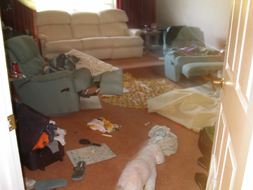 | Missy investigates the bedroom. She figures with all that stuff, there's got to be some food somewhere! |