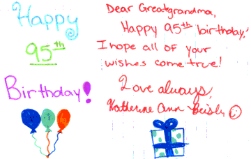 "Great grandma, how are you? This is why I love you. I love it when you took us to Demertrios, I love it when you took us to your yacht club, I love it when we take trips to your house. I love you for being you. Happy Birthday, Love Thomas."