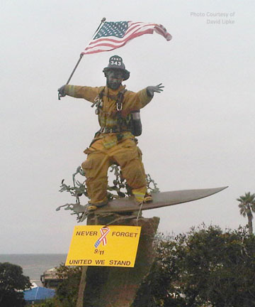 At the end of the Oceanside Pier is a restaurant called Ruby's. We had lunch there are the lesson. Marc and Kathy left for the San Diego airport, but were able to see the statue called "The Cardiff Kook," so named because people think it's a bit too much (actually, I think that's pretty much what surfers do look like). So, they dress him up from time to time. Because it was close to 9/11, he appeared as you see here.
