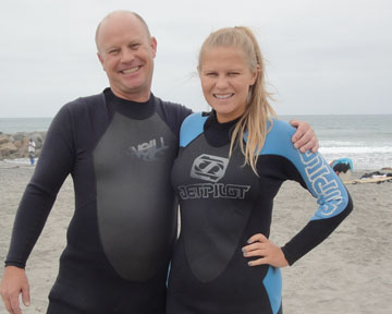 Above: heading out to catch a wave. Right: rinsing off afterwards