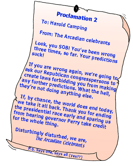 The end of the world was predicted twice during 2011, by Harold Camping. We decided to take him seriously, and arranged a party at which some of us (you know who) would ascend bodily into heaven. We decided that since it was the end, to have everyone bring just desserts (we furnished some KFC chicken). All in all, the food would be terrible for us, but what the heck, it was the end, wasn't it?