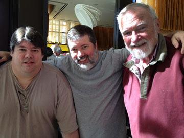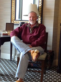 We decided to stay at Caesar's (first time). Lower left, Ken relaxes in the only chair in the room, then poses with David in a downstairs hall. The room view (below right) was across a parking lot to the Wynn hotels and the Venetian, where we usually stay.