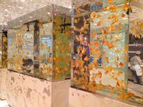 We had lunch on Saturday at a Chinese noodle restaurant with three huge tanks, filled with live gold fish (left). On a trip through the Forum Shops I saw a large fish tank with this cute ray who seemed to be clowning around for the audience.