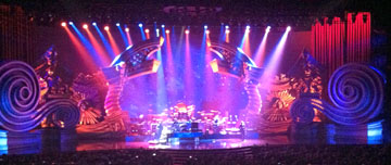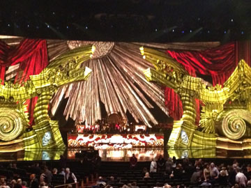 The show, entitled "The Million Dollar Piano" was named that because Elton John had the Yamaha company build a very special piano. It was a twelve-foot grand, the side of which was an LED panel (like a TV). It could show any images Elton wanted. So, the piano would change it's look based on the stage lighting and set up. Sometimes it virtually disappeared into the stage. The literature says he controlled the changes with voice commands. The photo immediately below is the way the stage looked when we walked into this 4,000 seat arena. The close-up below that photo shows the side of the piano, which looks identical to the background stage. I circled the piano in blue so you can see it.