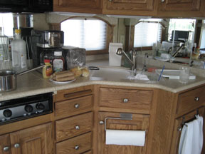 Today Ken drove two rest stops and I drove one. Here are some pictures of the inside of the Moose as we travel. You can see how little space we have to walk from the front toward the refrigerator or the bathroom. The left picture is kitchen, the right is the dining room.