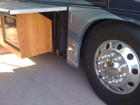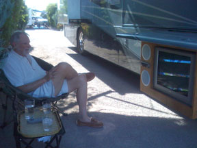 Tonight it's a cookout under the awning and watch some golf on the outside TV, if it's not too hot. (You can see how the TV pulls out.) The second picture shows how big the tires are.