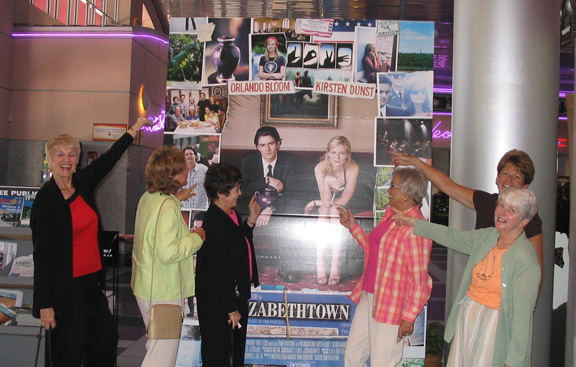 At the theater standing near the "Elizabethtown" poster, the ladies attending the Sarasota opening. First serious, then not.
