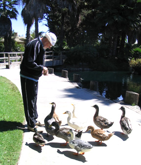 We bought some duck food and found a ready and willing audience. The one to the left would paddle hard to get sort of upright, then catch anything I could throw to it. Better by far than my dog, in terms of accuracy.