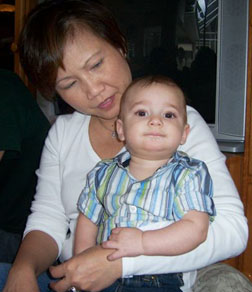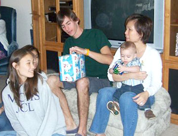 Ken and Lisa invited lots of relatives to their house for the day. Everyone brought a gift. Numbers were drawn and people chose in succession, trading a gift if they wanted. Lots of fun and laughter. Ken deep friend two turkeys, which was a new things for most everyone. The hit of the day was the young 7-month old Jordan, son of Matt and Jessica Olivera, and great-great-grandson of Edythe.
