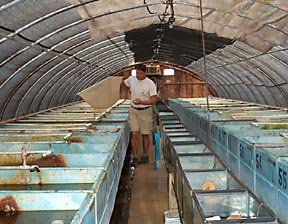You can see the smaller tanks where eggs hatch to Tom's left. The bigger tanks on the left side of the picture are made of concrete (Tom says they are burial vaults without the top -- really!). |