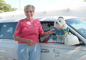 | Jeannie drove the Grants and Johnstons in the new limo for its first real test drive. Of course, Missy came along, dressed in her finest fish-patterned outfit, with cut-outs of fish on the windows, as well. |