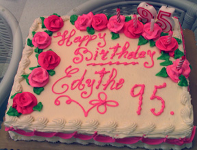 Here we are, celebrating Edythe’s 95th birthday. I sit here I think of the amazing person my grandmother is. I think of her everyday and all the simple wonders she has brought to our lives. Edythe is a wonderful mentor for us all. In today’s world of high tech, complicated things. I remember the little things she has shown me, the things that make life precious. Things like fresh squeezed orange juice, playing a card game or making a puzzle, a cross stitch Christmas ornament. These little jewels or permanently fixed in my mind.
