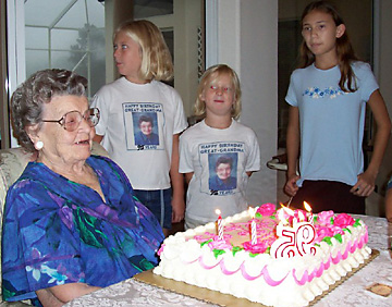 | Kaitland and Erika wore their shirts from Edythe's 90th birthday party. Ashley watches as Edythe gets ready to blow out the candles. |