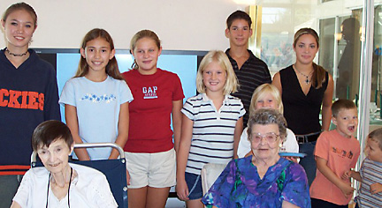 Left: Sue Douglas and Edythe's great grandchildren: Amanda, Ashley, Catherin, Kateland, Thomas and Jessica Mitchell, Erika, Thomas and Ryan Johnston