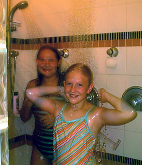 | The girls loved the big shower and got together each evening for a lot of water. Modesty prevented everyone from being in the picture. |