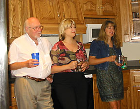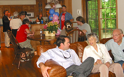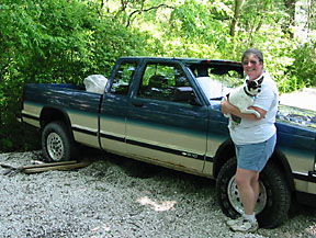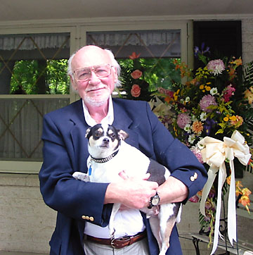 | June 9: Day of the memorial service. Everyone met at Don's house. The big excitement (other than getting everyone dressed and the house picked up), was Don and Sharon's good friend Mary, who brought over some tables and chairs, and got stuck in the driveway. Mary is holding the beloved Taco. | |||||||||||||||||||||||||||||||||||||||||||