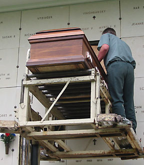 | Workmen used a fork lift to raise the casket high up in the crypt. Sharon would have a beautiful view. | |||||||||||||||||||||||||||||||||||||||||||
