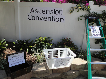 Placed around thoughtfully, was a laundry basket for putting neatly-folded clothes into, before the ascension, and a ladder to help short people. On the left there was a container for wallets and other important items. Below right, Debbie Pfeiffer begins moving her clothes to the laundry basket as her husband Don looks on skeptically.