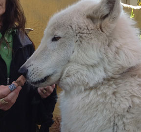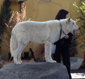 As you probably know, today's dogs as we know them are descended from wolves. This was a purebred wolf. His paws seemed huge. His face was lovely, and he even sang for us.