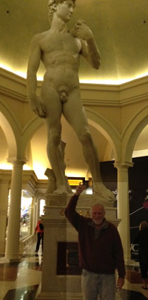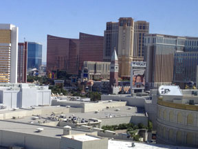 We decided to stay at Caesar's (first time). Lower left, Ken relaxes in the only chair in the room, then poses with David in a downstairs hall. The room view (below right) was across a parking lot to the Wynn hotels and the Venetian, where we usually stay.