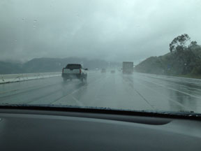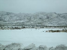 On Friday, our travel from Oceanside to Las Vegas was on a pretty icky day. Up in the mountains it poured down rain. When Eric and Andy came on Saturday, the view on the right is what they saw (it had turned into snow).
