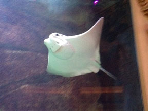 We had lunch on Saturday at a Chinese noodle restaurant with three huge tanks, filled with live gold fish (left). On a trip through the Forum Shops I saw a large fish tank with this cute ray who seemed to be clowning around for the audience.