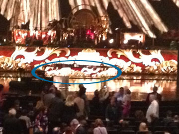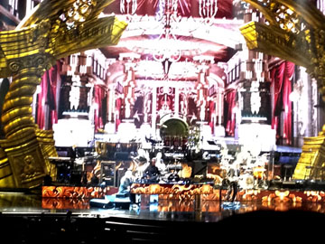 The show, entitled "The Million Dollar Piano" was named that because Elton John had the Yamaha company build a very special piano. It was a twelve-foot grand, the side of which was an LED panel (like a TV). It could show any images Elton wanted. So, the piano would change it's look based on the stage lighting and set up. Sometimes it virtually disappeared into the stage. The literature says he controlled the changes with voice commands. The photo immediately below is the way the stage looked when we walked into this 4,000 seat arena. The close-up below that photo shows the side of the piano, which looks identical to the background stage. I circled the piano in blue so you can see it.